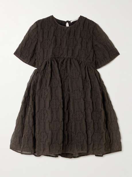 "For me, there is power and strength in romance and femininity", says Cecilie Bahnsen. Florals are one of her favorite motifs, appearing throughout the Summer and Fall '25 collections. Dyed one of the colors of the season, 'Soil Brown', this 'Britney' dress is made from matelassé and has a big, puffy skirt to match the billowing sleeves.