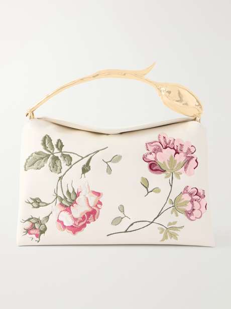 The sculptural ‘Bloom’-shaped handle on Erdem’s bag is crafted from gold-tone brass using a meticulous lost wax-casting technique that takes seven hours to complete. Made from leather embroidered with a floral motif, it also features a detachable shoulder strap for versatile cross-body wear.