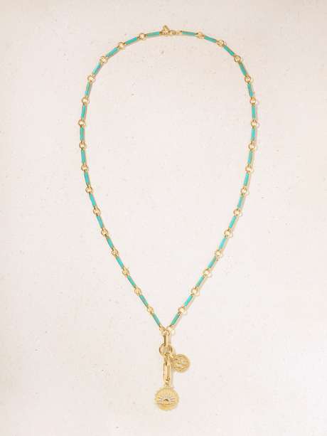 In line with Foundrae's 'New Beginnings' range, the rising sun on this necklace symbolizes the potential in each new day. Crafted from 18-karat gold, it's encrusted with diamonds and has veined turquoise throughout the links.