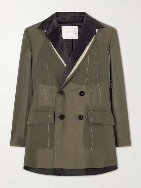 SACAI Double-breasted pleated embroidered satin-trimmed organza blazer