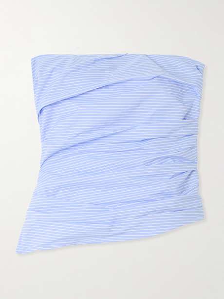 SIMKHAI Emerson strapless ruched pinstriped cotton-poplin bustier top