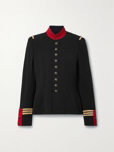 Finally, who says a black jacket can’t be a statement piece? This utility style comes with gold epaulettes, a standing collar in a pop of red and embellished, buttoned cuffs. The beauty of an intricate design like this is that you can pair it with low-key separates and still achieve a striking look. With its streamlined silhouette, it also pairs equally well with straight-cut and wide-leg pants.