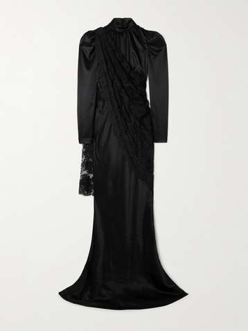 Cape-effect lace-trimmed silk-satin gown