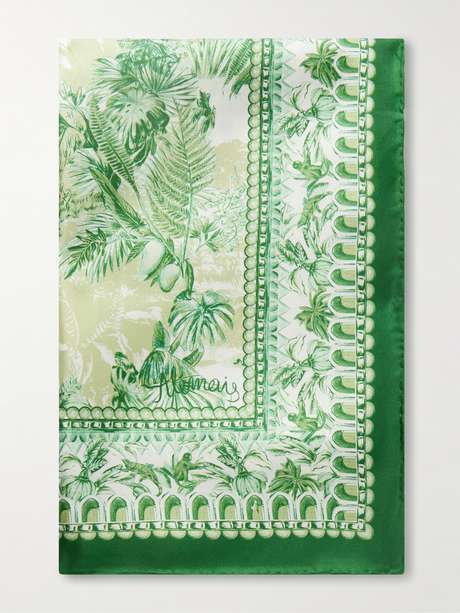 Alémais celebrates her origins with artful storytelling prints, such as the 'Sara' scarf, which is patterned with palms and fauna. Cut from fluid silk twill in a vivid green hue, its' extremely versatile and can be worn in a variety of ways – either tied around your neck or hair, or as a top.