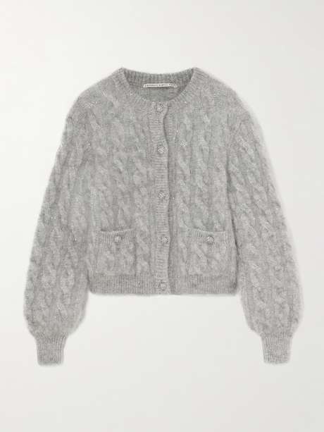 Alessandra Rich's cable-knit cardigan is flecked with tiny sequins, sparkling in the light. It's thick and cozy with contrasting buttons dotting the placket and pockets. Try it out with a pair of leather pants.