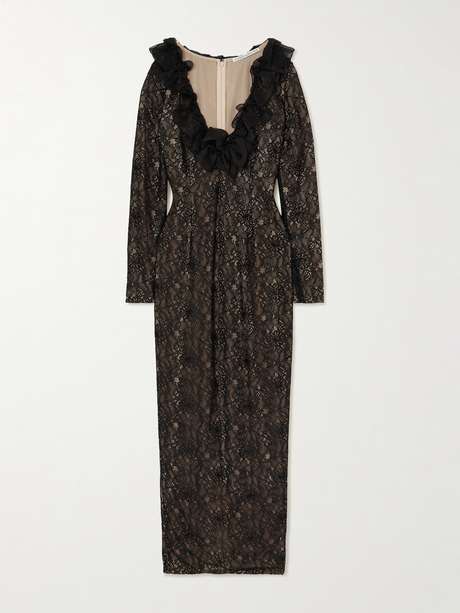 The plunging neckline of Alessandra Rich's midi dress is framed with romantic silk-organza ruffles and centered with a playful bow. It's made from lace that fits close through the body and is lined to temper the sheerness. Wear yours with sandal heels.