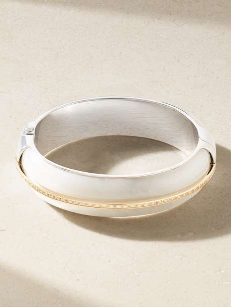 By Pariah's 'Pebble' bracelet is hand-carved from white jasper, a stone that symbolizes hope, peace and tranquility. It’s mounted in polished sterling silver and has a diamond-encrusted 14-karat recycled gold band tracing the center. The chunky profile is perfect for stacking with dainty styles.