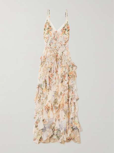 We love how the ruffles tumble down Camilla's dress. It's made from fine silk-chiffon in a figure-skimming slip silhouette that feels effortless, romantic and bohemian.