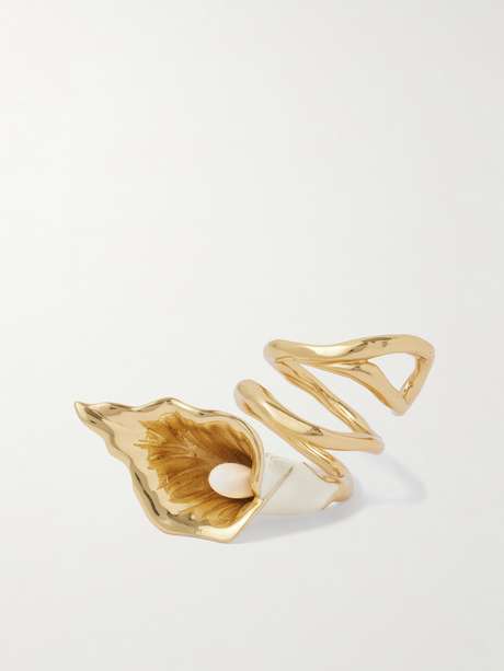 Chloé's ring is shaped to resemble an elegant flower wrapped around your finger. Seen on the Spring '26 runway, it's made from gold-tone brass and enamel and intricately etched with lines and logo lettering. Wear yours solo for the most impact.