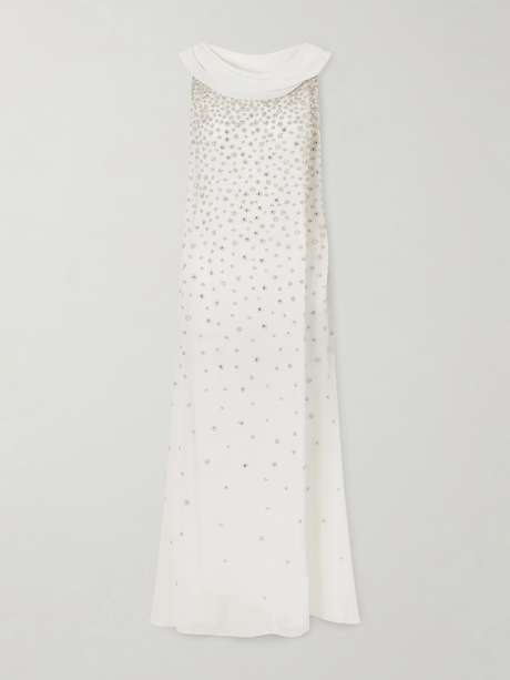 EXCLUSIVE AT NET-A-PORTER. Clio Peppiatt's 'Kaia' gown takes inspiration from Old Hollywood glamour with a scarf-detailed neckline that drapes gracefully along the back. Made from crinkled-chiffon, the fluid silhouette is traced with cascading crystal embroidery for a refined, celebration-ready finish.