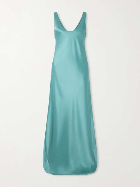 Galvan’s 'Valletta' gown embodies modern, minimalist elegance. Cut from lustrous satin that catches the light beautifully, it falls in fluid lines over the body and features a plunging neckline and floor-sweeping hem. Pair it with heeled sandals and subtle jewelry.