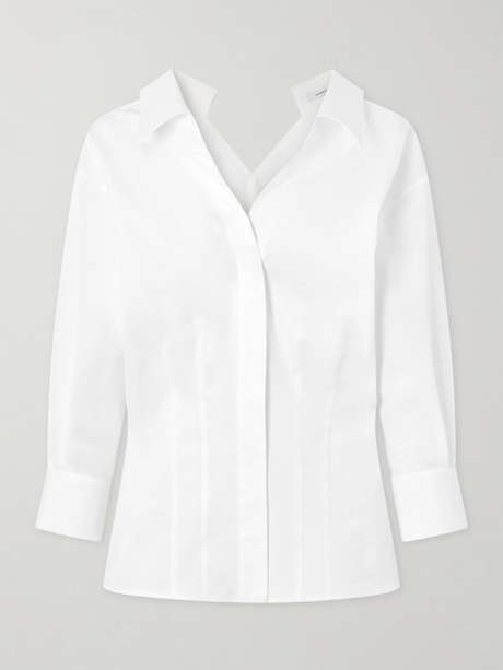 Givenchy offers a slight twist on the ever-timeless white shirt. It's been skilfully tailored in Italy from breathable cotton-poplin with darting at the base to define the waist. You can choose to wear it buttoned to the top or positioned off one shoulder.