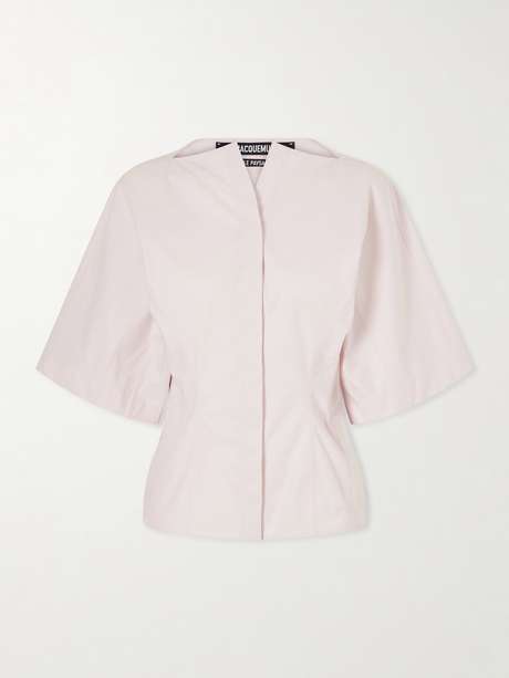Jacquemus’ "Moisson" shirt references the sculptural silhouettes of the Spring ’26 collection. Made from cotton poplin, it has wide sleeves and a cinched waist that creates an hourglass shape. Style it with a voluminous skirt and wedge sandals.