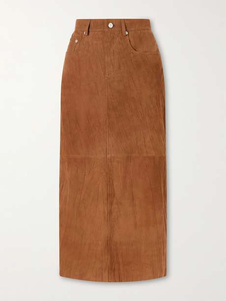 Proenza Schouler White Label’s ‘Nayah’ skirt is cut from suede panels in a timeless tan hue. Designed with a streamlined silhouette, it has a subtly crinkled finish that enhances its understated appeal.