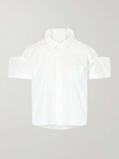 Sacai often reconceptualizes the classic elements of a closet. This shirt is tailored from poplin with origami-inspired folded sleeves that articulate the shape.