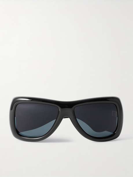 SAINT LAURENT Eyewear's 'Howl' sunglasses are a fusion of retro and futuristic styles. Debuted during the '80s-inspired Spring '26 runway show, they have oversized pillowy D-frames with gold-tone logos on the wide arms and tonal lenses.