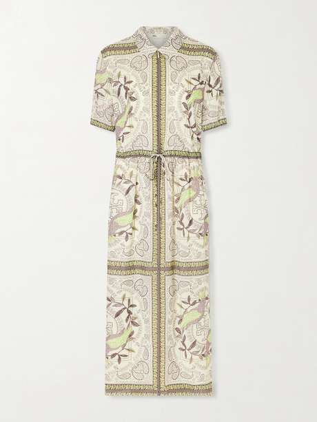 Tory Burch embodies modern American style through polished silhouettes and thoughtful detail. This dress is crafted from a lightweight silk and cotton-blend, patterned with a whimsical paisley and parrot print incorporating the label’s logo. Designed with a relaxed fit, zip front and drawstring waist, it works well with simple sandals for warm days in the city.