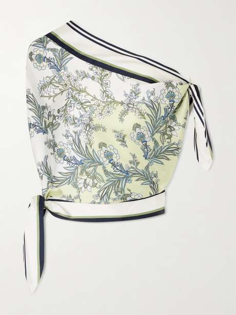 Veronica Beard's 'Tari' blouse fuses effortless elegance with sculptural ease. Cut from fluid twill in a scarf-inspired silhouette, it features a one-shoulder design with waist ties for a draped fit. The light green botanical print is framed by graphic stripes. Pair with denim or the matching pants for a polished look.