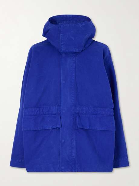 Victoria Beckham’s jacket is crafted from durable cotton-canvas in a vibrant blue hue. Its oversized silhouette is ideal for layering during transitional seasons and features a wide stand collar with a hood, along with utility pockets at the front for functional style.