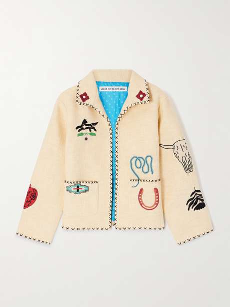 Inspired by classic Western motifs, the artful embroidery and bead embellishments adorning Alix of Bohemia's 'Francis Rye Tattoo' jacket are completed entirely by hand. It's tailored to subtly cropped proportions from tactile cotton-tweed with an open front and a duo of patch pockets. A closer look allows you to appreciate the needlework.