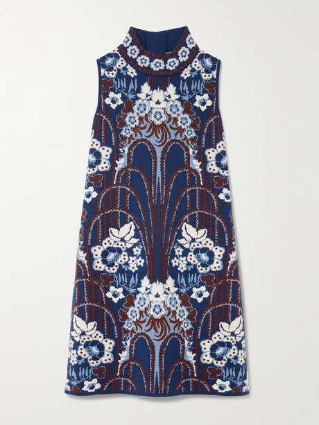 Nature and Art Deco inspired Cara Cara's 'Ayla' dress. Depicting pretty blossoms, it's jacquard-knitted from wool-blend and has a retro shift shape topped with a turtleneck. Enhance the metallic glow with shimmering accessories.