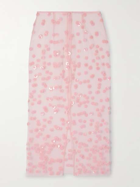 Cecilie Bahnsen's 'Gus' skirt is covered with shiny sequins and beads arranged to resemble cherry blossoms. It's cut in a chic, column shape from sheer tulle and comes in a pretty pastel-pink shade – mix and match yours with tonal pieces from the Scandi brand's latest collection.