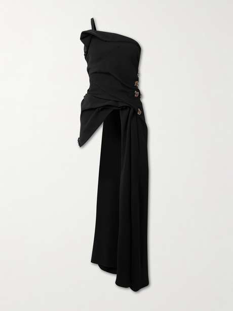 Dries Van Noten's one-shoulder top is artfully draped to evoke a state of undress – look closely and you'll notice the lingerie-inspired eyelet trim. Made from black crepe, it's embellished with sparkling beads and crystals and has a trailing asymmetric hem. Style yours with a floor-length skirt or straight-leg pants.