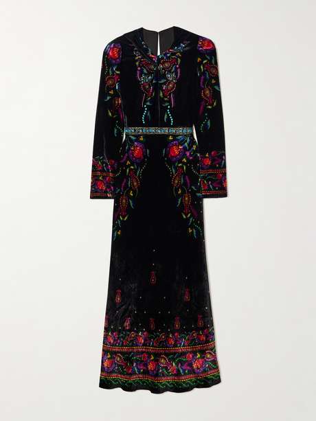 Saloni often updates its 'Claudia' midi dress in different fabrics and finishes. This version is made from plush velvet in a baroque floral pattern with a twist at the neck and beaded band to define the waist. Pick out the purple or red tones with your nail color.
