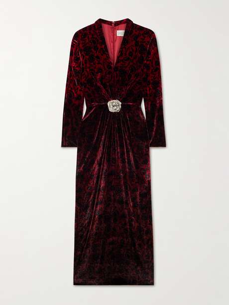 Saloni's 'Mya' dress is a stunning choice for winter events and the holiday season. Made from plush velvet, it's printed with florals and paisley swirls and has a deep V-neckline with narrow lapels. At the waist sits an ornate crystal-encrusted rose.