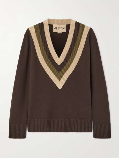 Valentino Garavani's striped sweater has a bold V-neck, inviting you to layer it over a buttoned shirt. It's knitted from wool with ribbed edges for added structure.