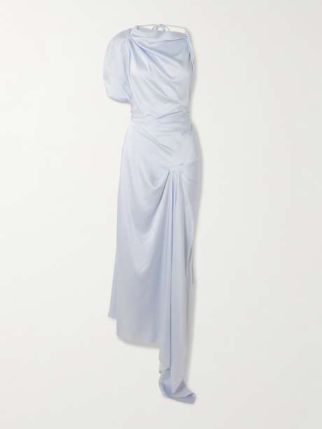 EXCLUSIVE AT NET-A-PORTER. Victoria Beckham's midi dress comes in a shade of 'Ice' blue that'll suit the warmer seasons as well as the winter. Made from lustrous satin-crepe, it's twisted and draped into a one-shoulder neckline and is gathered through the flowing asymmetric skirt.