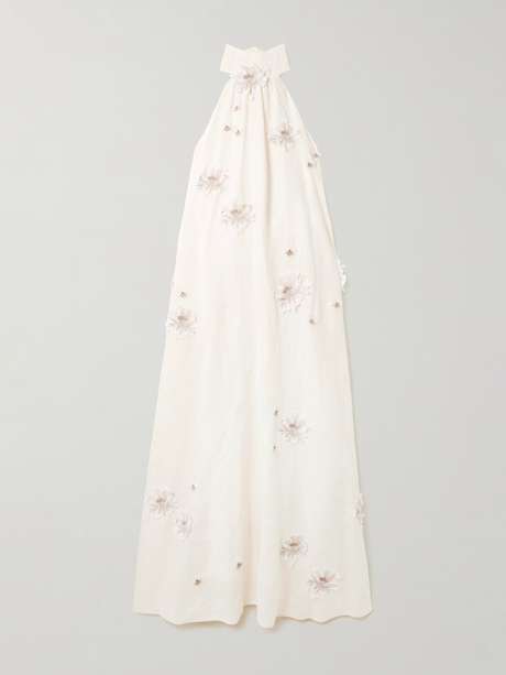 EXCLUSIVE AT NET-A-PORTER. Agua by Agua Bendita's dress is brought to life by the embroidered and beaded floral appliqués. Made from breezy linen, it has an elegant halter neckline with long sash ties and falls to a floaty maxi hem. Wear yours on vacation with platform espadrilles.