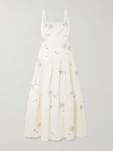 EXCLUSIVE AT NET-A-PORTER. Agua by Agua Bendita's 'Lima' dress channels the label's romantic spirit with effortless grace. Cut from linen, it's appliquéd with delicate floral motifs and subtle bead embellishments that bring texture and dimension to the flowing, tiered silhouette. Style yours with pared-back sandals and gold jewelry to let the intricate details shine.