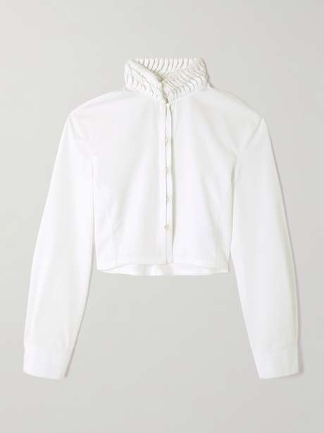 The artfully folded collar on Alaïa's shirt is reminiscent of ruffs from the Elizabethan era. Made from cotton-poplin, it has a cropped hem and a layered placket traced with tonal mother-of-pearl buttons. Wear yours with high-waisted jeans or tailoring.