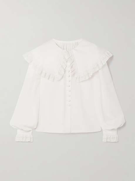 Chloé's Winter '25 collection draws inspiration from the romanticism of vintage clothing. Cut from organic silk for a loose fit, this blouse has ladder stitching and delicate lace trims tracing the oversized collar and flouncy buttoned cuffs.