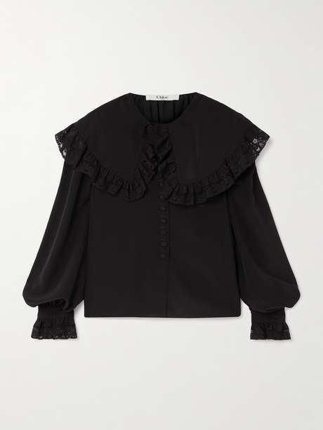 Chloé's Fall '25 collection draws inspiration from the romanticism of vintage clothing. Cut from organic silk for a loose fit, this blouse has ladder stitching and delicate lace trims tracing the oversized collar and flouncy buttoned cuffs.