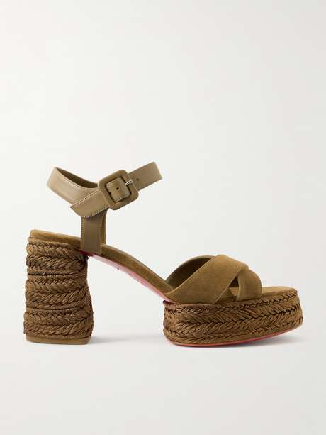 A fresh interpretation of the classic espadrille, the 'Calakala' sandals by Christian Louboutin showcase the house’s signature craftsmanship. Suede cross-over straps frame the upper, while the platform rests on a braided jute sole. A buckled ankle strap secures the fit.