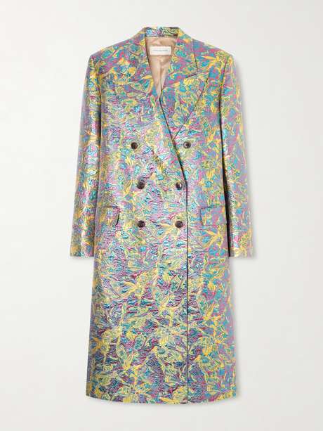 DRIES VAN NOTEN Double-breasted metallic floral-jacquard long coat
