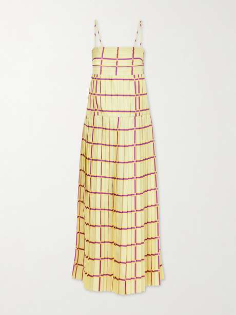 Emilia Wickstead’s Spring ’26 collection refines classic structure with a lighter touch. This 'Agata' silk-twill gown is patterned with checks and intricately pleated to create movement through the bodice and floaty skirt.