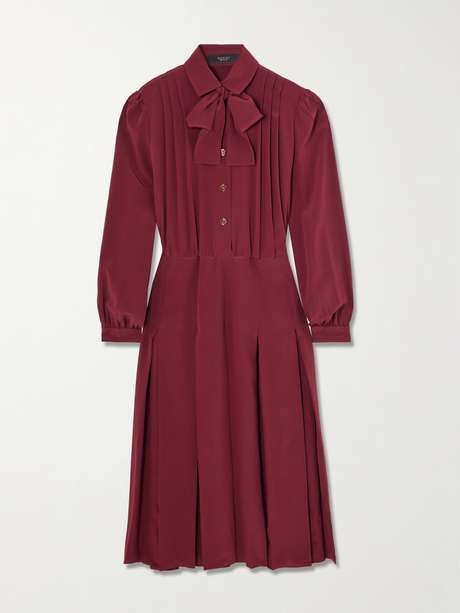 From the deep burgundy shade to the pussy-bow ties, Gucci's dress is imbued with bold elegance. It's made from wispy silk crepe de chine and pleated throughout to enhance the floaty shape. Match your jewelry to the gold-tone 'GG' buttons.