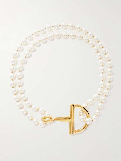 Gucci's necklace is embellished with half a horsebit - it's the label's new take on the iconic emblem. The gold-tone design is detailed with spacer beads dotted between faux pearls.