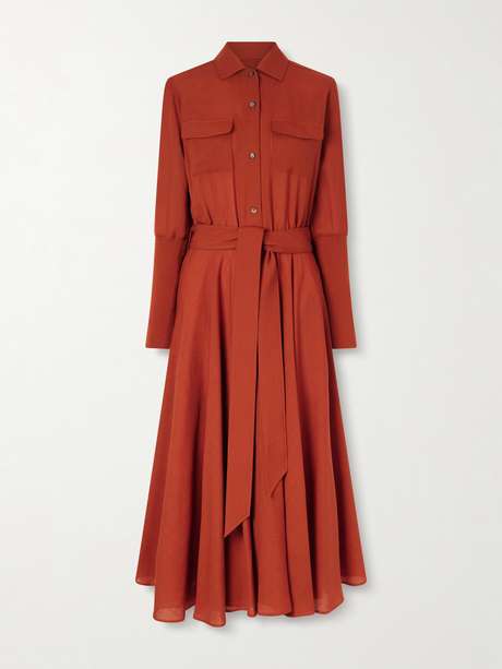 Loro Piana's 'Verlaine' shirt dress is a refined take on a classic silhouette. It's made from weightless wool and has a waist-cinching belt before falling to a fluid skirt. The fitted cuffs add structure and balance proportions.