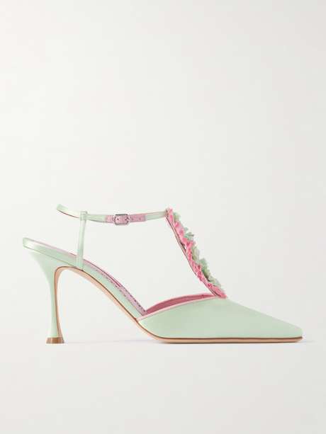 EXCLUSIVE AT NET-A-PORTER. Manolo Blahnik's capsule with London's V&A museum is inspired by the "fantasy and fairytale" of Marie Antoinette's style. Made in Italy from satin, these 'Hebes' pumps have appliquéd T-bar straps and fluted 90mm heels.