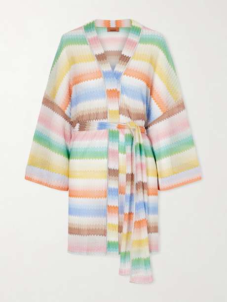 Missoni Mare's belted coverup brings a playful sense of movement and color to your beachside collection. Crochet-knitted with subtle shimmering threads, it’s defined by the signature striped patterns and cut for a relaxed silhouette that layers effortlessly over swimwear.