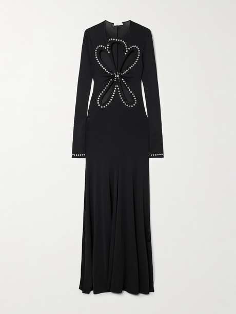 Rabanne's dress has skin-baring cutouts through the front, which gather at the center to create a floral effect. Made from slinky jersey, it's cut for a close fit and embellished with silver-tone hoops and studs. Style yours with heels and dark lipstick.
