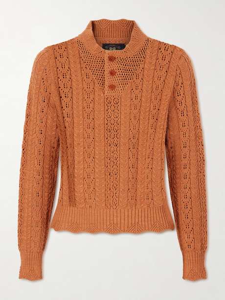 RRL’s ‘Hannah’ sweater feels like it’s been passed down through generations. Made from crocheted cotton, it has a high neck finished with a button closure and has ribbed trims. Wear yours with pants or skirts.