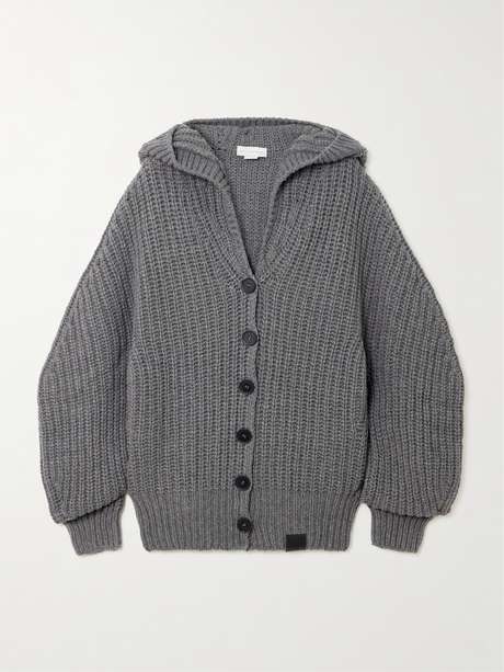 Slouchy proportions define Stella McCartney's Winter '25. Worn at the runway show, this hoodie is rib-knitted from recycled-cashmere and wool-blend with a cozy hood and relaxed blouson sleeves.