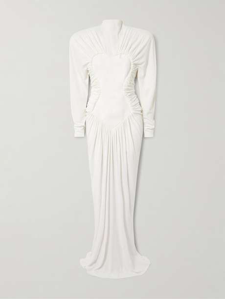 Stella McCartney's Winter '25 collection explores both structure and sensuality. This gown is made from two layers of certified viscose-crepe and has a mesh panel surrounding the torso to support the sweetheart-shaped bodice. The shoulder pads create cool definition.