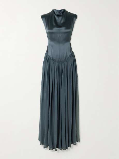 Fit for occasions that call for decadence, TOVE's 'Sabi' gown is bias-cut from fluid, steel-colored silk-satin. It has a draped cowl neckline before cascading to a gathered chiffon skirt that'll sway as you move.