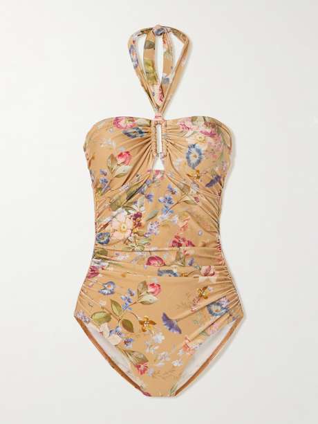 Zimmermann's 'Patience' swimsuit is perfect for any relaxing spa retreat or island getaway. Made from floral-print stretch fabric, it has halterneck straps anchored by a structured cutout and is ruched along the sides.